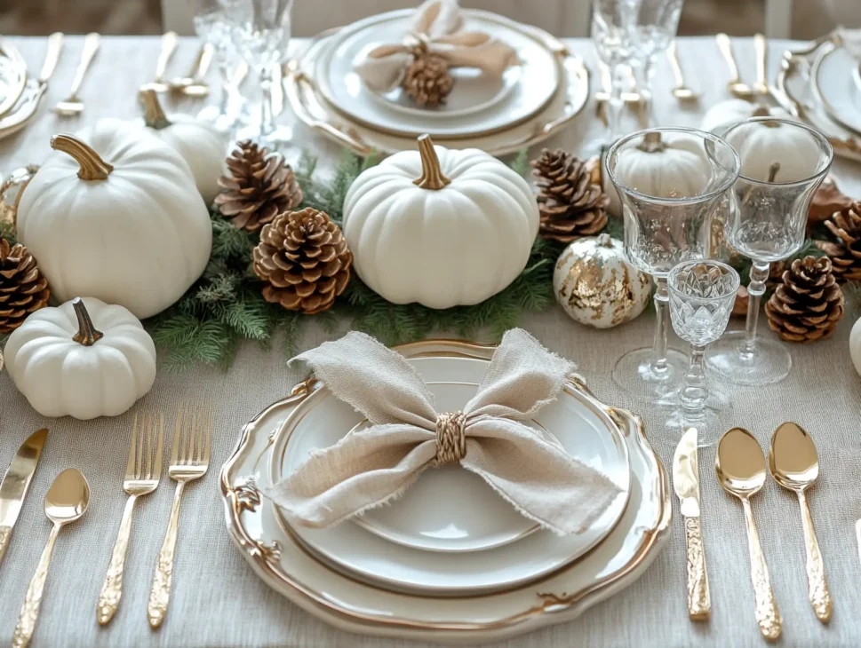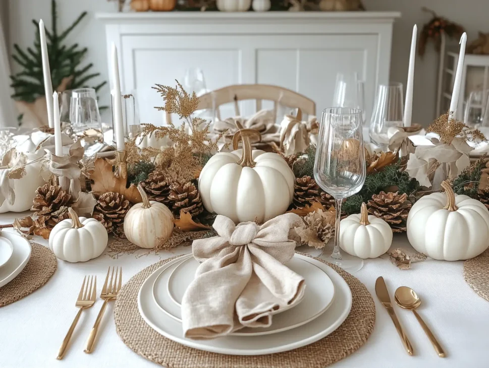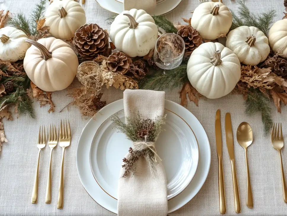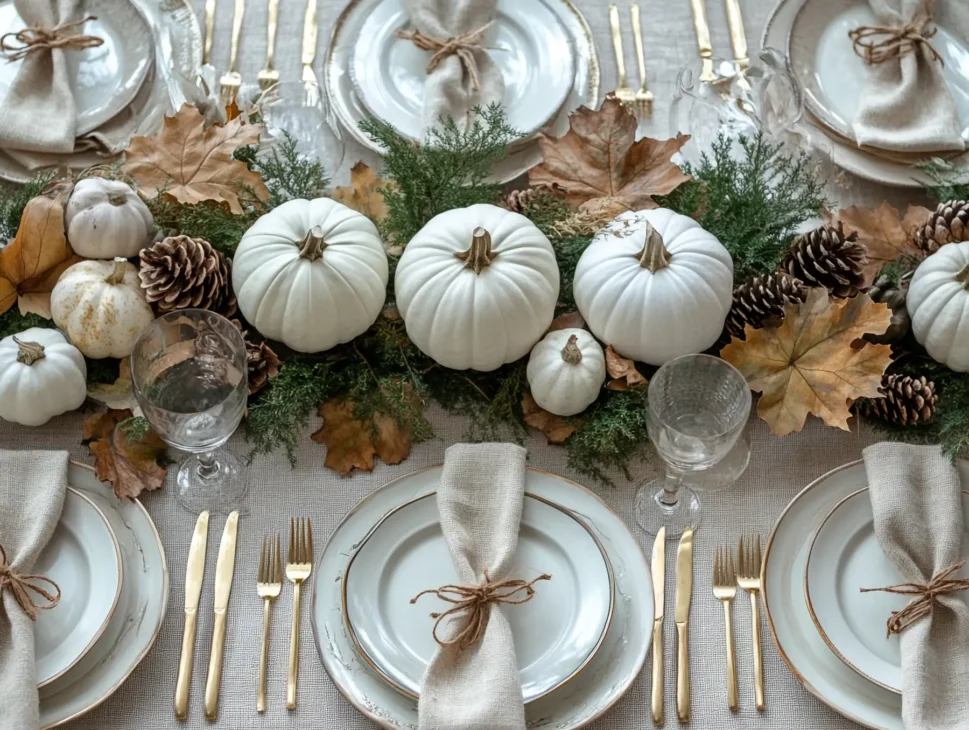 Focus on a single centerpiece (e.g., one large white pumpkin) and skip chargers to save space while maintaining style.